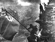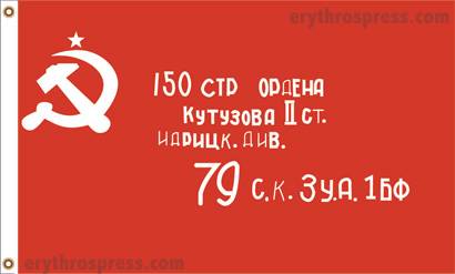 The raising of the Victory Banner was commemorated in a legendary photo by Yevgeny Khaldei.  Victory Banner #5″ which was one of several flags raised by Red Army soldiers over the Reichstag to signal the fall of Berlin during the final days of World War II (known in the former USSR as “The Great Patriotic War”.)  An inscription is included on Victory Banner #5 by one of the military subdivision responsible for the capture of the Reichstag.  The Cyrillic writing reads, “150th Rifle, Order of Kutuzov 2nd class, ‘Idritskaya’ Division, 79th Rifle Corps, 3rd Shock Army, 1st Byelorussian Front.”  The actual Victory Banner #5 is currently in a Russian museum.  The USSR commissioned the production of several replicas of the flag after World War II for use in the Victory Day parade held in Red Square every May 9th.  In 2007, a number of Russian “reformers” began a movement to remove the hammer and sickle from the Victory Banner.  Following a massive outcry from Russian war veterans, Russian President Vladimir Putin signed a bill into law preserving the Soviet-era iconography as a national symbol of the victory over fascism.